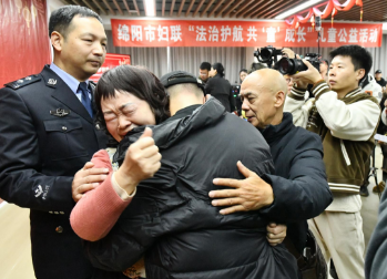 2024月12月12日,在绵阳市公安局“胡祥雨工作室”的帮助下,失踪38年的曾文豪在认亲仪式上与亲生父母紧紧拥抱。打拐民警胡祥雨(左一)当选2024“最美基层民警”。