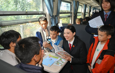 2024年11月19日,在法治车厢里,法官陈小容为同学们宣传保护未成年人的法律知识。与成昆线同龄的“慢火车”,是大凉山群众出行最重要的交通工具。成铁两级法院的干警们定期会登上这辆“彝乡情·法治慢火车”,为从山区前往西昌求学的孩子们送去精彩的法治公开课。